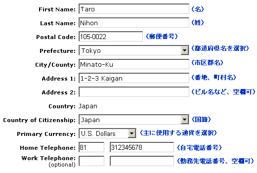 Postal Code は、半角文字で123-4567または1234567のように記入します。